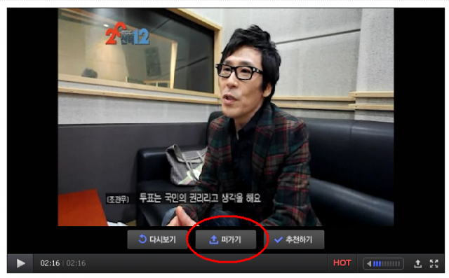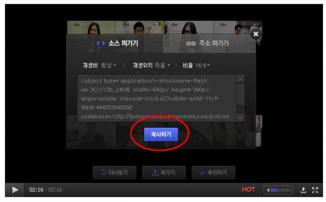 동영상을 다 보면 퍼가기 버튼이 나옵니다.